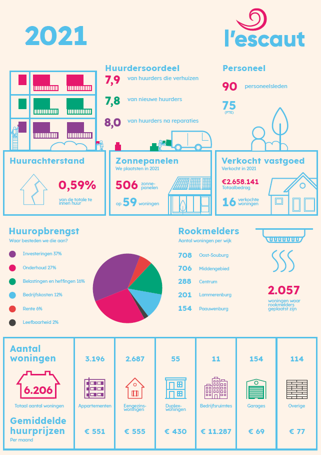 Het jaar 2021 stond in het teken van luisteren, bouwen en groeien. In de dialoog met bewoners, huurdersvereniging l’escaut (HvL) en andere stakeholders kunnen we door te luisteren nog veel meer én beter invulling geven aan onze rol als belangrijke maatschappelijke speler. Zoals in het project Crocuslaan en omgeving. In de Scheldewijk bouwden we 24 duurzame woningen én we leverden de eerste 47 woningen op aan het Ravesteynplein. Zoals je van ons mag verwachten doen we dat duurzaam. De wens om ons meer te laten beïnvloeden door bewoners en andere stakeholders vraagt van ons als organisatie om ons verder te ontwikkelen. Dat doen we door te groeien tot de professionals die nodig zijn om invulling te geven aan onze maatschappij-gedreven rol. Zo maakten we samen met HvL, stakeholders, huurders en collega’s een nieuw ondernemingsplan waarin onze maatschappij-gedreven rol centraal staat. Hierover binnenkort meer. 2021 is mede door corona een bewogen jaar geweest. Het vroeg flexibiliteit en creativiteit om de dagelijkse dienstverlening aan onze klanten door te laten gaan, waarbij we regelmatig de grenzen van de mogelijkheden opzochten.