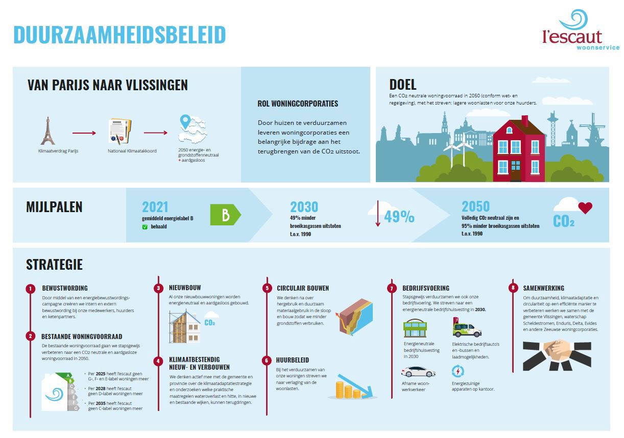 De maatregelen in het Klimaatakkoord zijn onderverdeeld per sector. Gebouwde omgeving is er daar een van. Sjors: “Woningcorporaties, waaronder l’escaut, leveren in deze sector een belangrijke bijdrage. Dat doen ze door de bestaande woningvoorraad te verduurzamen naar CO2-neutraal en aardgasvrij in 2050. In 2020 stelde l’escaut een nieuw duurzaamheidsbeleid vast. Aan de hand van acht thema’s verduurzamen we de bouw, het beheer, het gebruik en de sloop van onze huurwoningen. Onderstaande poster laat in één oogopslag zien waar we voor staan.”